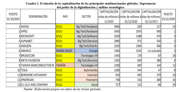 Es evidente que ha habido un cambio radical en las pautas de poder y dominio entre sectores productivos, con una dinámica en la que la manufactura y la energía, dominadoras en el pasado de la capitalización global, se han visto sustituidas de manera radical por las tecnológicas que, a su vez, están absorbiendo y controlando las empresas asociadas a los medios de comunicación, unificando la información y el discurso público y cultural a sus intereses.