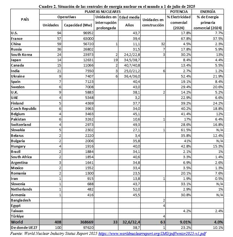 De forma detallada, en el Cuadro siguiente se recogen los datos oficiales de plantas nucleares en operación y en construcción, a 1 de julio de 2025, destacando el hecho de que los siete países recogidos en el Cuadro (no figuran ni Corea del Norte ni Israel) que poseen armamento nuclear poseen casi el 70% de las centrales nucleares y más del 71% de la capacidad nuclear instalada. Y, salvo en el caso de China, con 32 de los 63 centrales en construcción en el mundo, EEUU no tiene ninguna, Rusia tiene 7, el Reino Unido tiene 2, y en la UE27 solo Eslovaquia tiene una en construcción.
