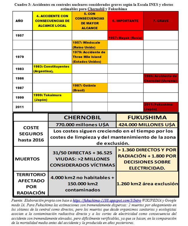 En la reducida dinámica de expansión de centrales nucleares en los últimos 15 años han influido los sucesivos accidentes nucleares graves, desde 1957 a 2011, recogidos en el Cuadro siguiente, que minaron progresivamente la confianza en esta tecnología, impulsaron movimientos antinucleares, paralizaron nuevos proyectos y aceleraron las políticas de eliminación gradual de la energía nuclear en diversos países. Lo que, además, ha venido acompañado de los fuertes retrasos y dificultades en la construcción de plantas nucleares de tercera generación, con un aumento vertiginoso de sus costos de construcción y mayores costes del capital necesario. Incremento de costes que han alejado sus posibilidades de competir con la rápida caída de los precios de las energías renovables e incluso con el coste energético asociado a los combustibles fósiles.